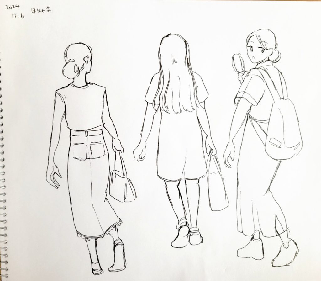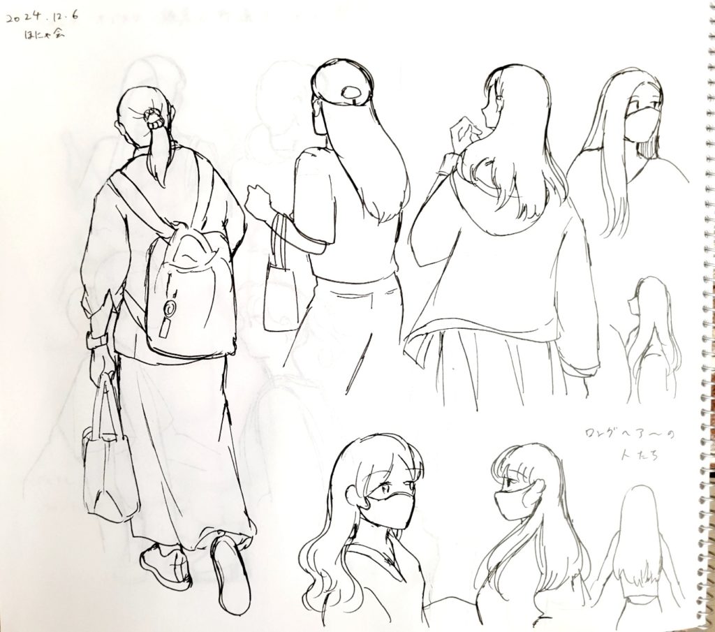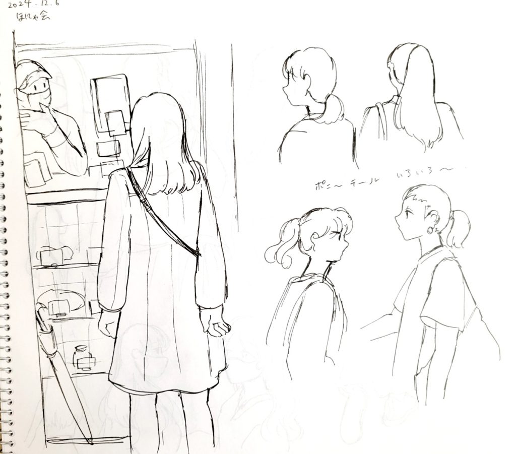 2024/12/06 ストビュースケッチ 2024-12-06 VST/スタディ VSTのオンラインサロンVST酒場のほにゃ会(VSTをスタディする会)で描いたGoogleストリートビューのスケッチ。 場所は鎌倉小町通り 今回のテーマは『髪型の注目して描く』 2人組の髪型の違い ポニテしばりロングヘア―しばり なんか全身描きたくなって描いた人etc… たくさん描けて楽しかったです!